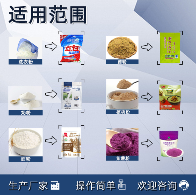 給袋粉末包裝機(jī)適用于包裝粉粒狀物料,如調(diào)味品、味精、葡萄糖、精細(xì)白糖、香精香料、粉狀添加劑、爽身粉、農(nóng)藥、獸藥等物料的袋裝。