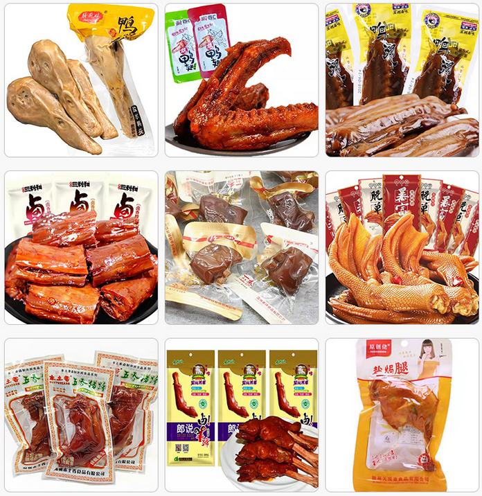 散稱豆干、榨菜絲、雪菜、酸豆角、茶干、大片豆干、雞米花、辣子雞塊、鹵蛋、雞翅等各種不規(guī)則物料、豆制品和醬腌菜的自動計量真空包裝