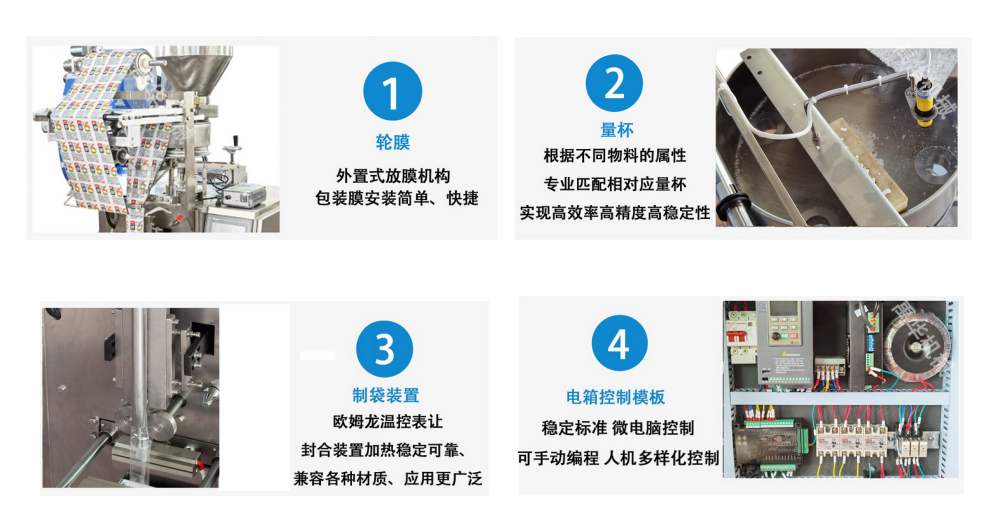 (4)全自動從計量,充填制袋,日期打印到產(chǎn)品輸出一次性完成