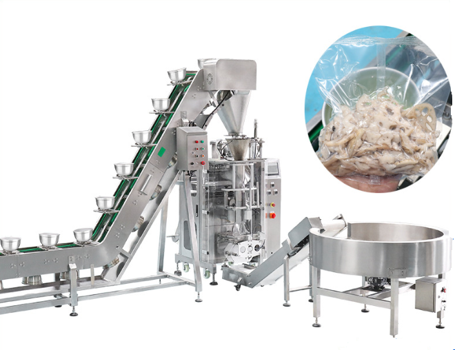 全自動預制菜生鮮蔬菜包裝機:可包裝胡蘿卜丁、玉米粒、青豌豆、西藍花米、花椰菜米、油菜心、菠菜段、口蘑片、南瓜塊、秋葵塊等冷凍蔬菜包裝。